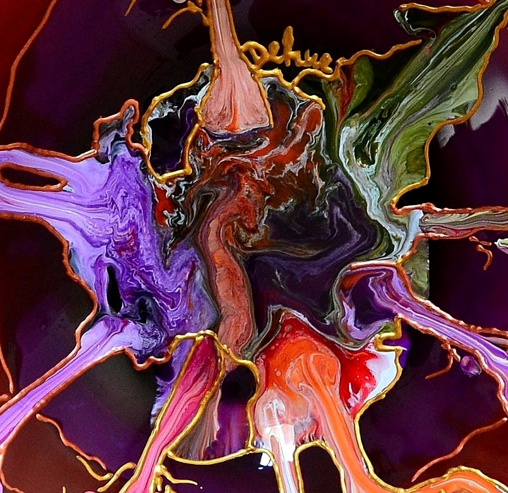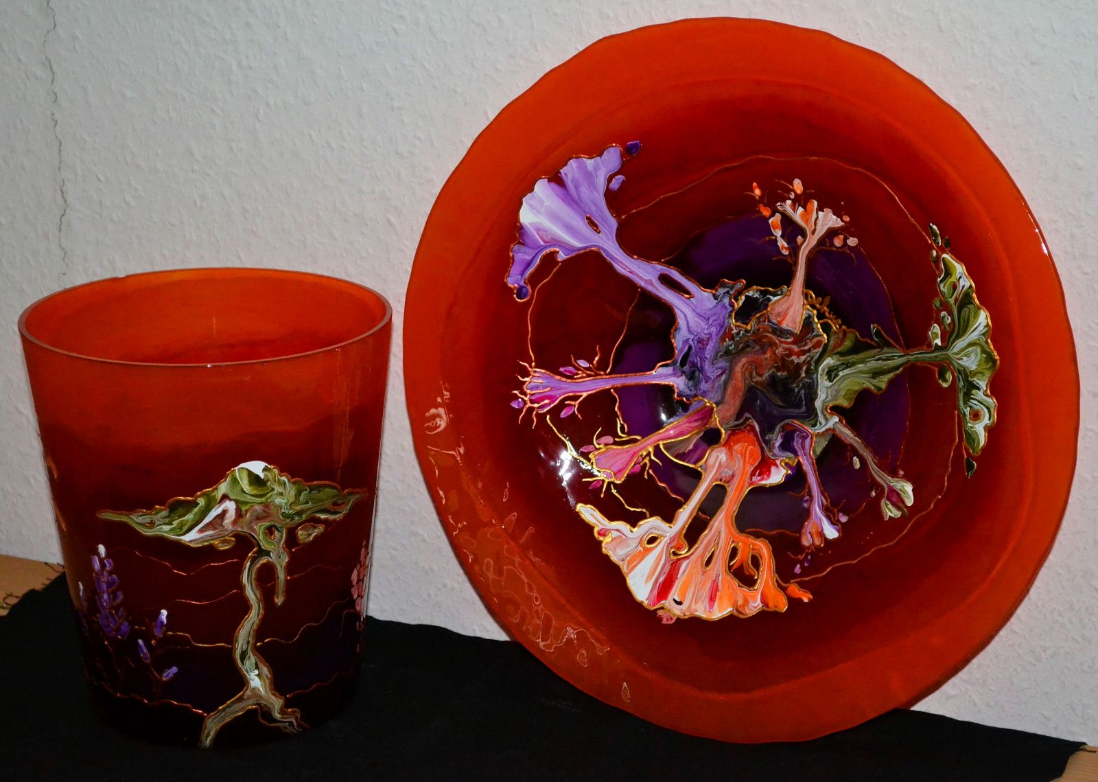 Schaal 9 (Flowers and trees). Kan als set samen met Vaas/windlicht 14. Glazen ronde schaal beschilderd met een abstract landschap met bomen en bloemen. In oranje, rode, roze, paarse, olijfgroene en bruine tinten afgezet met goud en koper. Hoogte 6,5 cm, doorsnede (rond) 35 cm. Inclusief certificaat van echtheid