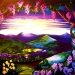 Kleurrijk (droom)landschap met bergen en meer en lichtval/lichtstralen vanuit de lucht en weerspiegeling van het land in het meer