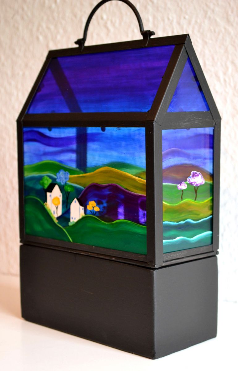 Handbeschilderd huis van glas, aan alle kanten verschillend beschilderd. Landschap met huisjes, heuvels en bomen in wit, geel, groen, violet, turquoise, blauw en zwart. Metalen frame met handvat. Het glazen huisje staat op een bakje van steen. Inclusief certificaat van echtheid.