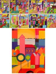 Mijn schilderijen (kleurrijk fantasielandschap 20 en 18) als lesmateriaal op een school in Engeland